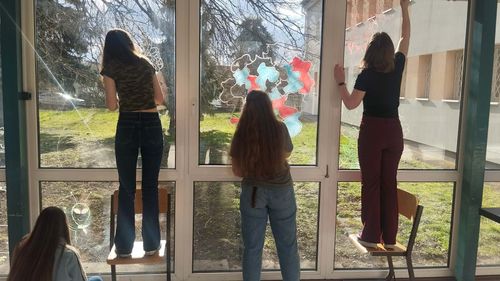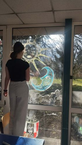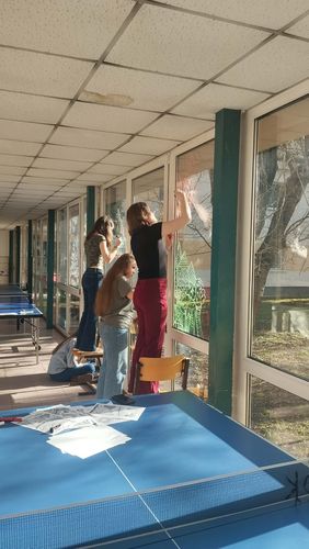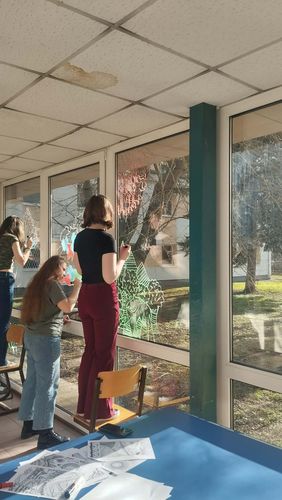 A madarak ablaknak ütközése komoly természetvédelmi probléma, amely évente rengeteg áldozatot követel, de megfelelő megelőző intézkedésekkel 95%-ban elkerülhető. A madarak azért repülnek az üvegnek, mert nem látják azt, és a tükröződő felületen a fákat, eget vagy a belső növényzetet észlelik, amit szabad menekülési útvonalnak vélnek. Az ütközés súlyos agyrázkódást, belső sérüléseket vagy azonnali elpusztulást okozhat. A megelőzés érdekében a rajzszakkörös diákok krétafilccel különböző, színes mintákat rajzolnak az üvegfelületeinkre, így fontos madárvédelmi funkciót is ellátnak: a sűrűn felvitt minták segítenek megelőzni, hogy a madarak a láthatatlan üvegnek ütközzenek. Köszönjük munkájukat!